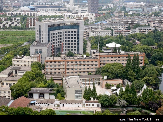 Visited by The New York Times, the PLA headquarters - just north of downtown Shanghai in the Zhabei district - were clearly marked as a "military zone." Soldiers guard the entrance to the building, which is surrounded by tall walls topped with wire fencing, a moat, and trees that camouflage military satellite dishes. Viewed from nearby landmarks, the building is full of military personnel and patriotic military slogans.